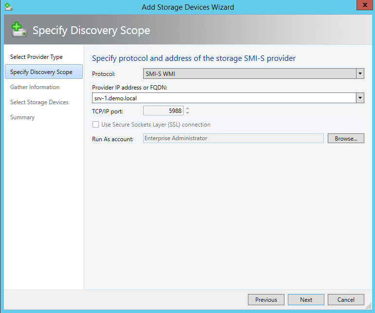 Um einen iSCSI Block Storage in das Storage Management aufnehmen zu können, wechselt man in den Abschnitt Fabric und startet den Add Storage Devices Wizard im Bereich Storage. In dem Wizard wählt man dann SAN and NAS devices discovered and managed by a SMI-S provider oder SAN devices managed by a native SMP provider aus und gibt im nächsten Schritt den FQDN des Servers sowie den Run As Account an. Für das Windows Server 2012 R2 iSCSI Target wählt man als Protokoll SMI-S WMI.